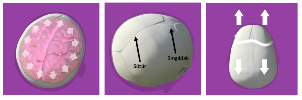 Kafatasının gelişmesi pasif bir olaydır. Alttaki beynin gelişip hacmını arttırmasıyla ittirilerek genişler. Bunun için yassı kafatası kemikleri sütür adını verdiğimiz aralarındaki elastik yapılar ile sütüre dikey yönde genişlemeyi sağlar. Beynin hacmi doğumdan sonraki ilk altı ayda iki katına çıkar, bir yaşa doğru bu genişleme yavaşlar, 1 yaşta erişkin beyin hacminin %80 ine ulaşır.